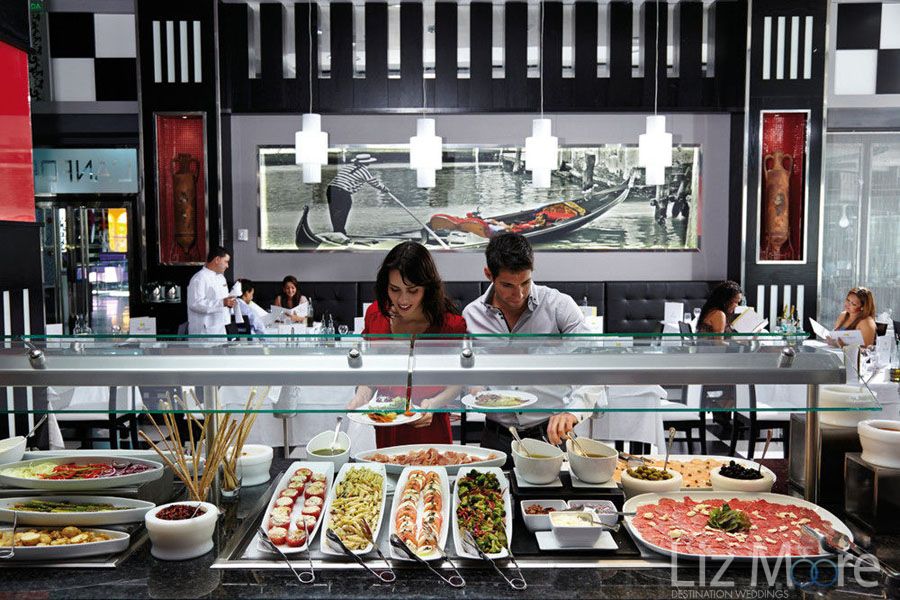 Lunch: Hot aur cold buffet with live cooking stations. Pizzas, pasta, salads aur assorted desserts (Italian restaurant).